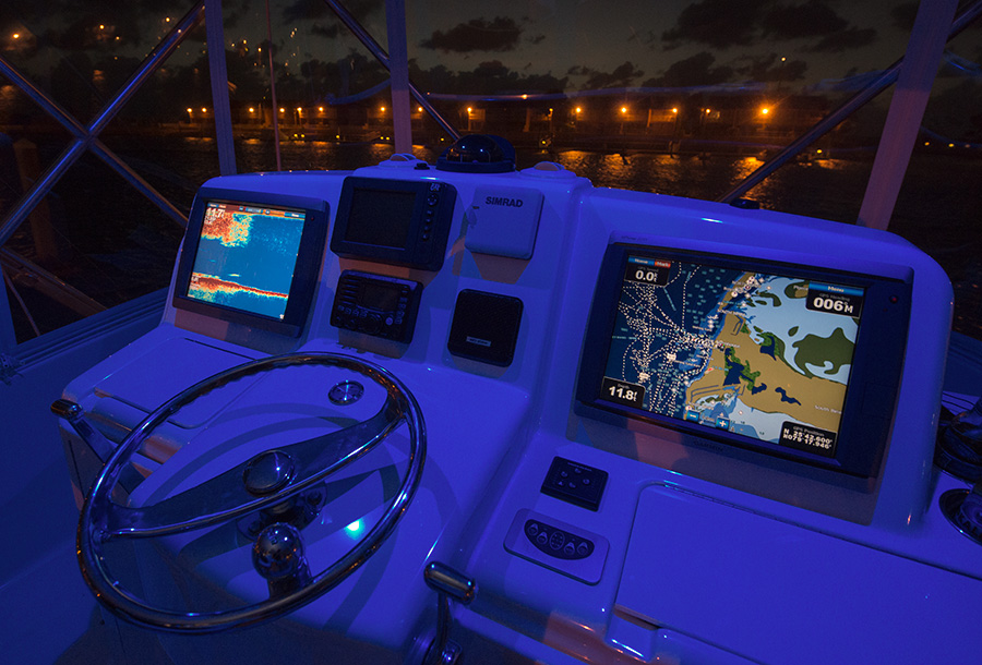 Boat panel lit with blue LCD cabin lights.
