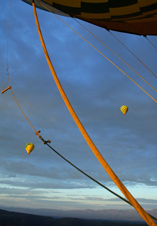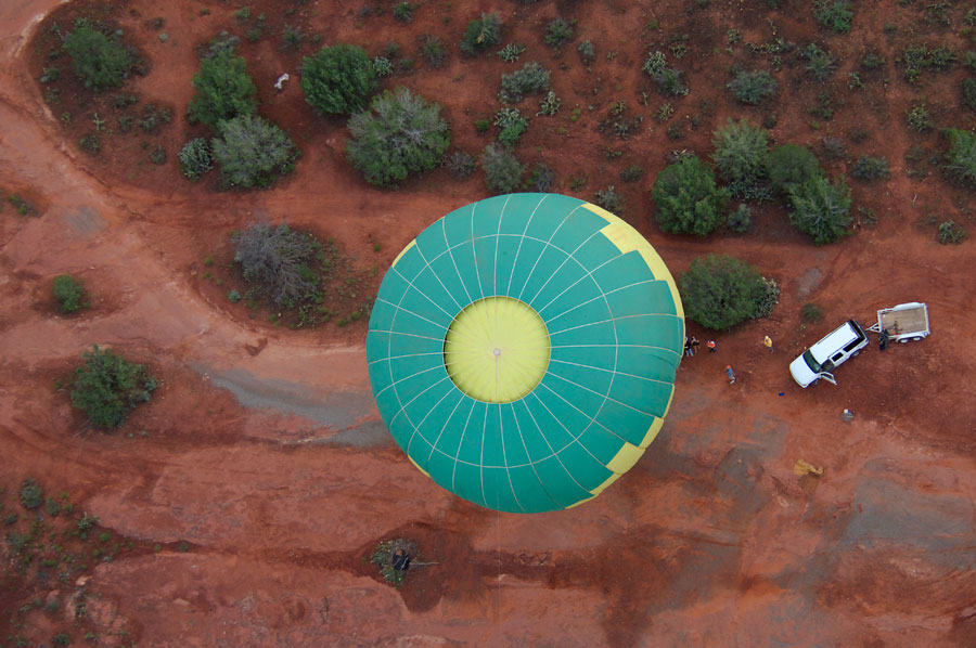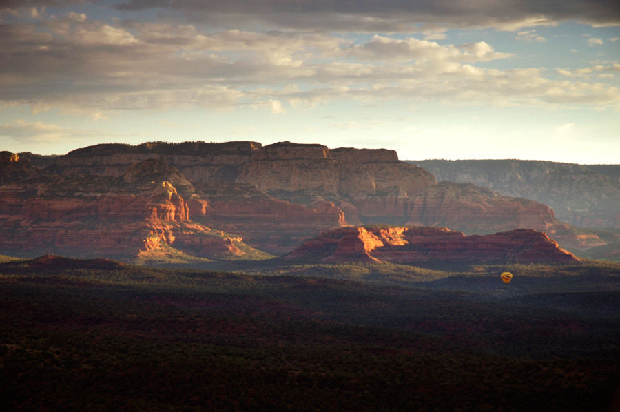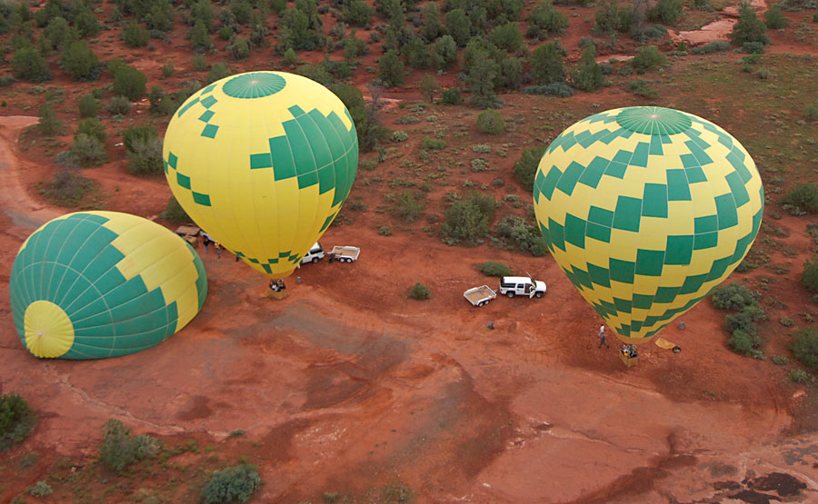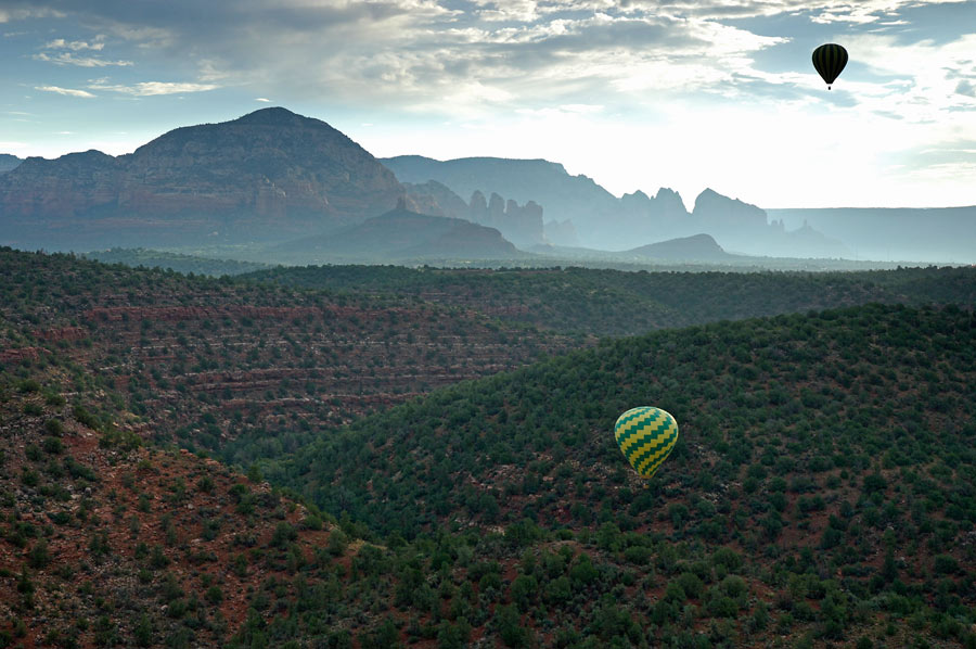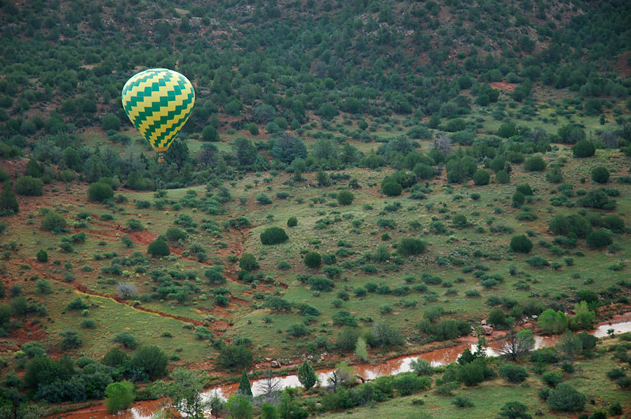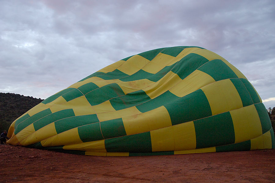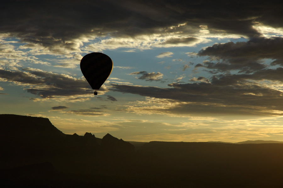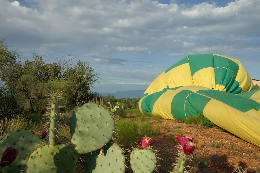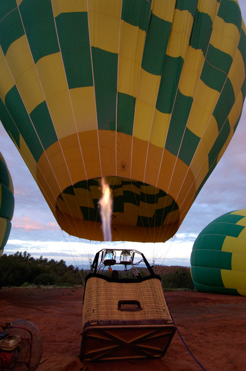 In Sedona, Arizona In August 2005 we took our first balloon ride outside of Sedona, Arizona. We had an early morning flight when the winds are calmest. Our particular balloon held six passengers and our pilot. The balloon company we used had four balloon flights that morning. En-route to the staging area, we asked our pilot how many years of experience he had. Our pilot observed that was a very good question to ask while on the ground, and surprisingly enough, often asked by passengers once in flight, 1,000 feet above Earth! (s = 35mm, m=6x7 Medium Format, l=4x5 Large Format)