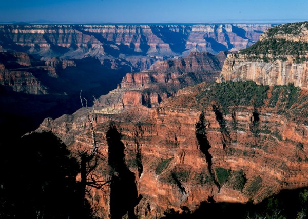 (Below) A view from the North Rim: The Canyon transept trail ("The box") follows our path and can be seen as a dark shadow moving diagonally from the lower left to the upper center of the frame