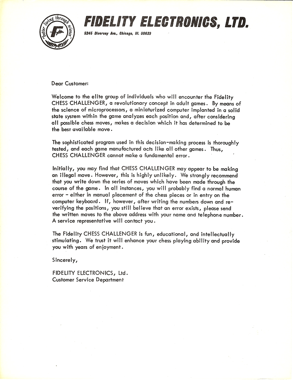 An insert sheet that came with the Fidelity Challenger 10. Back in 1978, few consumer products had a general purpose CPU, thus the introduction below. Home chess computers only appeared the year before, in 1977, with the Fidelity Chess Challenger 1.