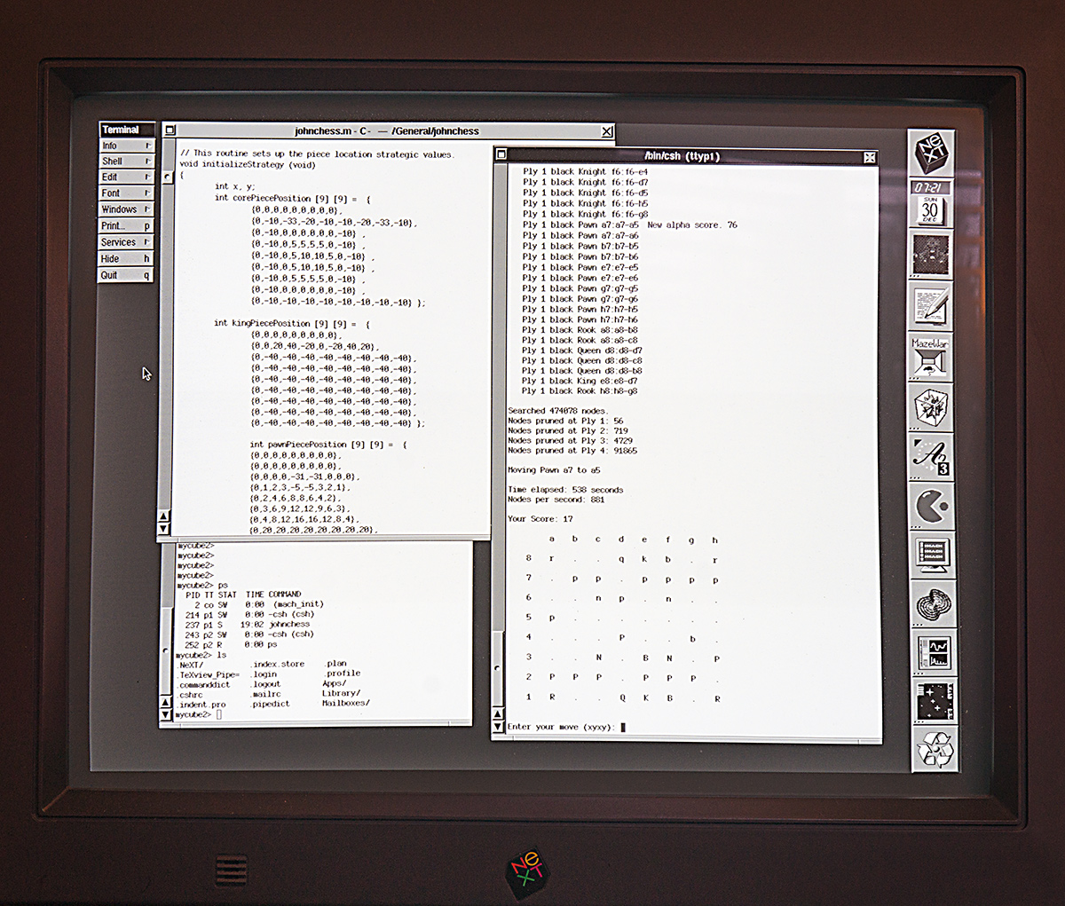 Below is my chess program. I developed this on a NeXT cube computer (1989 era), which can resolve about 1,500 moves per second. I wrote the program indepedently, but drew upon examples from the Internet for direction. Once developed, I ported my program and compiled it to run on a modern 3rd generation (Ivy Bridge) Core 5 laptop, which can examine about 4 million moves per second, compared to 1,500 moves per second on the NeXT. On a 2024 iMAC Mini with an M4 CPU, this rose to about 18 million moves a second