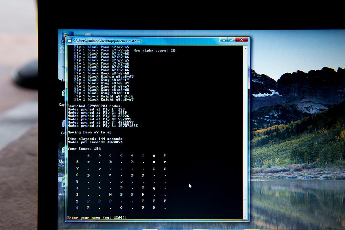 On the other side, an $800 dollar laptop, made of cheap plastic and faux metal, featuring a CPU that runs over 1,000x faster, and with more memory than an equivalent stack of Chess Challengers from here to Jupiter and back. On the modern machine image below, almost 579 million board positions were evaluated in the last play as it looked at outcomes 7 turns deep. To save time, my program uses a method called Alpha-Beta pruning to help eliminate millions of searches that produce potentially worse results than a previously found best move.