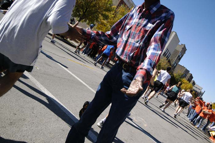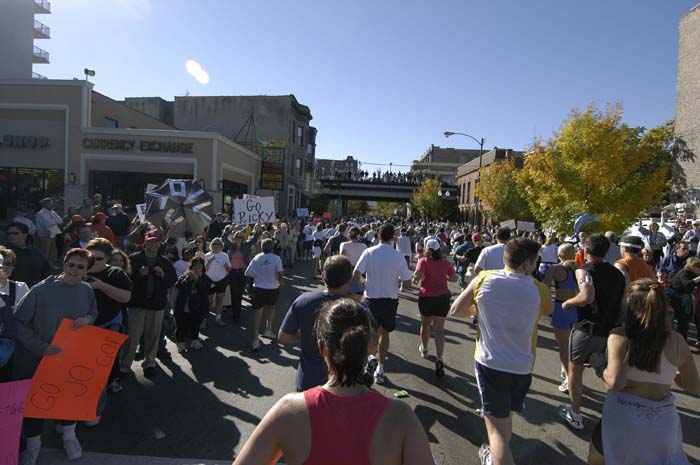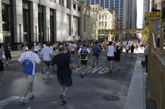 2003 Chicago Marathon - Mile by Mile Page II of III I wanted to visually capture as best as I could "what it's like" to run a large marathon. The 2003 Chicago Marathon, with over 40,000 participants, ranks the highest in number of participants of any marathon in the World. Because nothing but the best would suffice to you, the viewer, I carried a Nikon digital SLR with a wide angle 12-24mm lens. I shot over 250 images, sometimes while running, sometimes while pausing on the side. Below, in sequence is a photographic journal of the Chicago Marathon, which we can comfortably enjoy without having to run 26.2 miles! (s = 35mm, d = Digital, m=6x7 Medium Format, l= 4x5 Large Format) Even