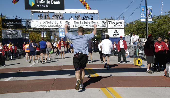 I enjoy my beer with relief and great satisfaction at completing the Chicago Marathon. (d)
