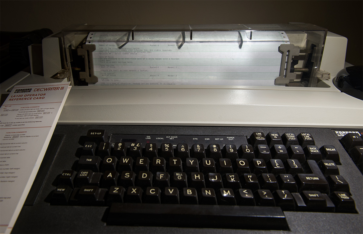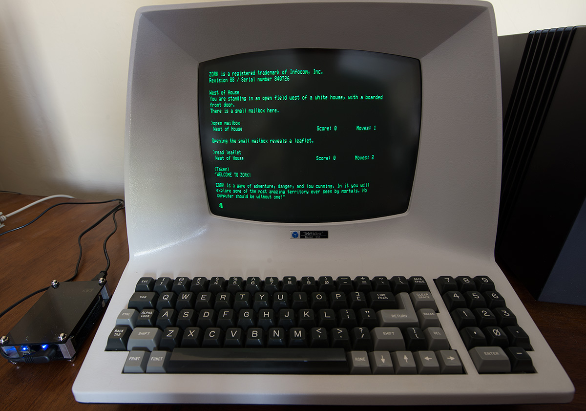 DEC connected to my Mac Pro (OS X 10.7.5) with a null modem cable and a RS-232 to USB converter. I downloaded and compiled an interpreter (Frotz) that can load Zork as well as Aventure, shown above in dumb terminal mode.