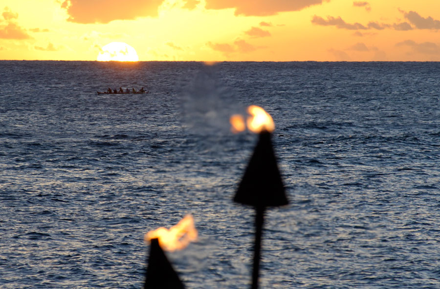Hawaiian canoe paddles during sunset near Poipu, Kauai