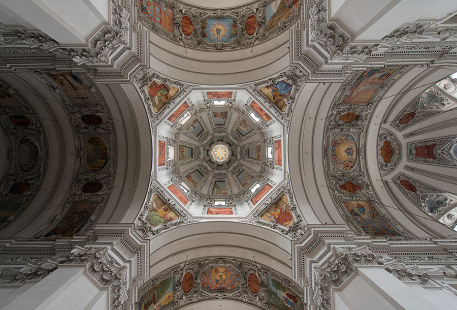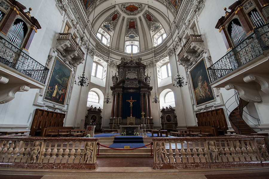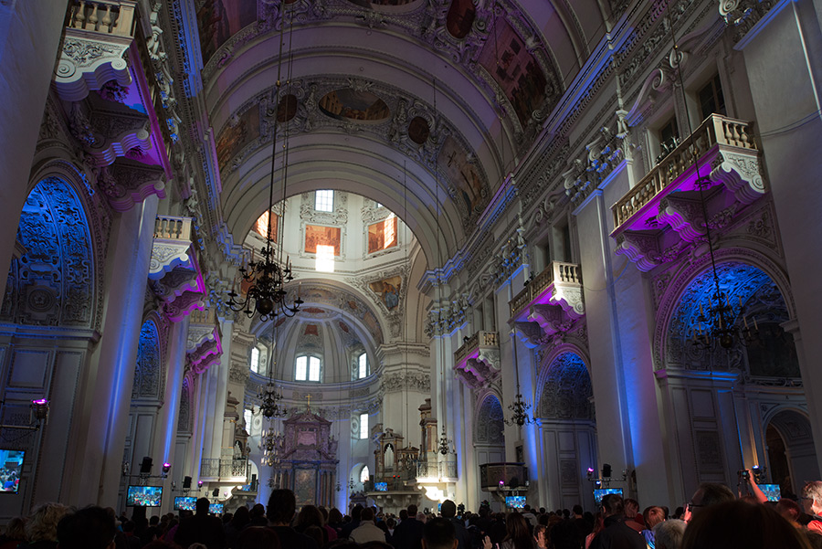 The Salzburg Cathedral, completed 1655, during service. The place of his baptismal, Mozart played the Cathedral's organ. The church periodically holds mass accompanied with Mozart's Requiem composition.