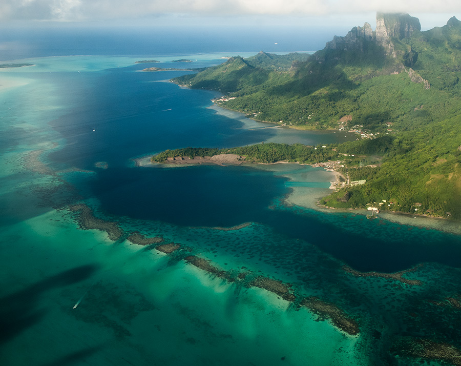 Bora Bora surrounded by lagoons, seen from the airplane.