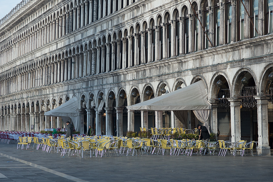 Early morning in Piazza San Marco, the cafes prepare the street side tables and chairs