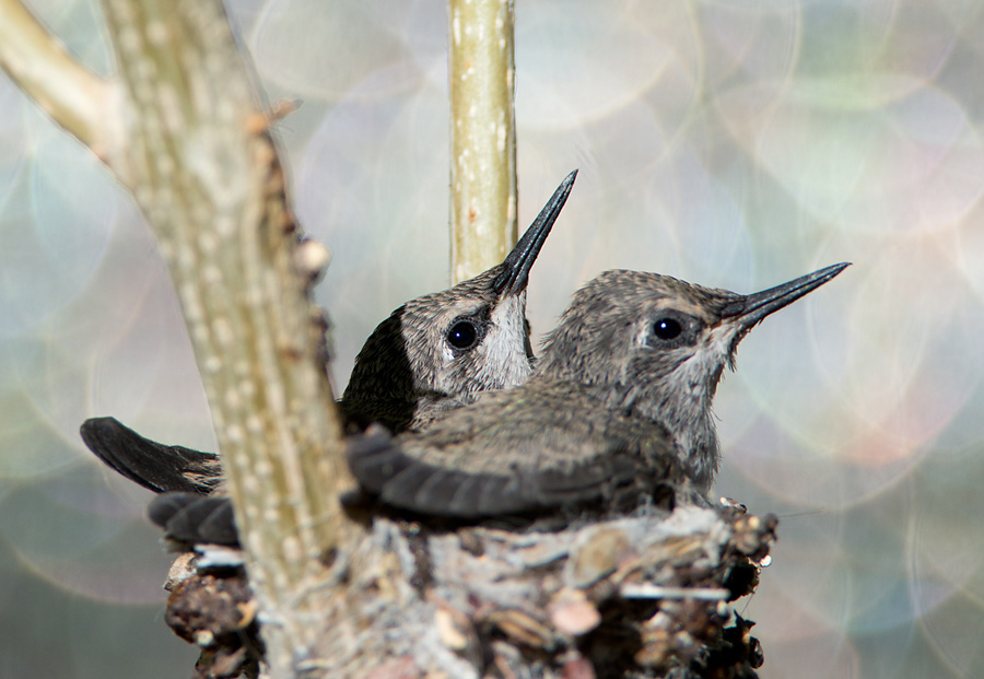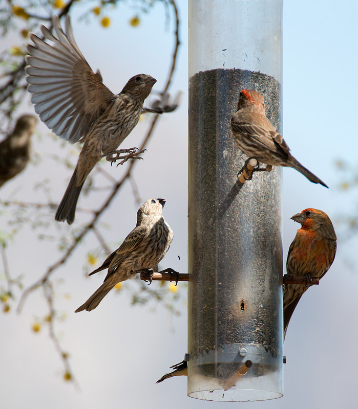 Drama in the backyard bird feeder as demand exceeds available spots. (d)