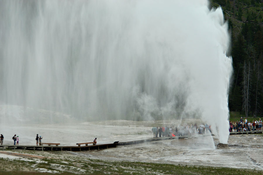 Tourists enjoy a geyser erruption.